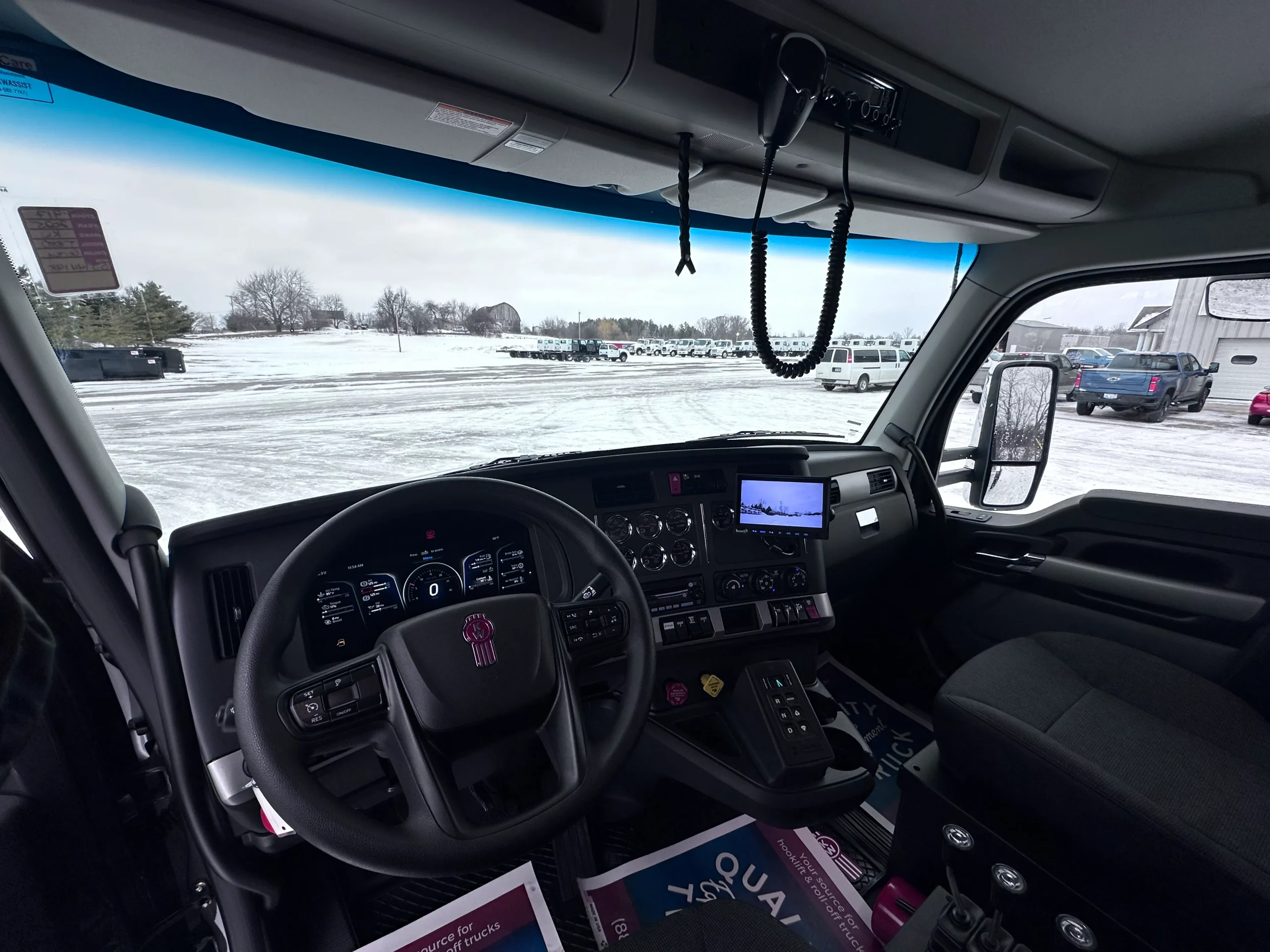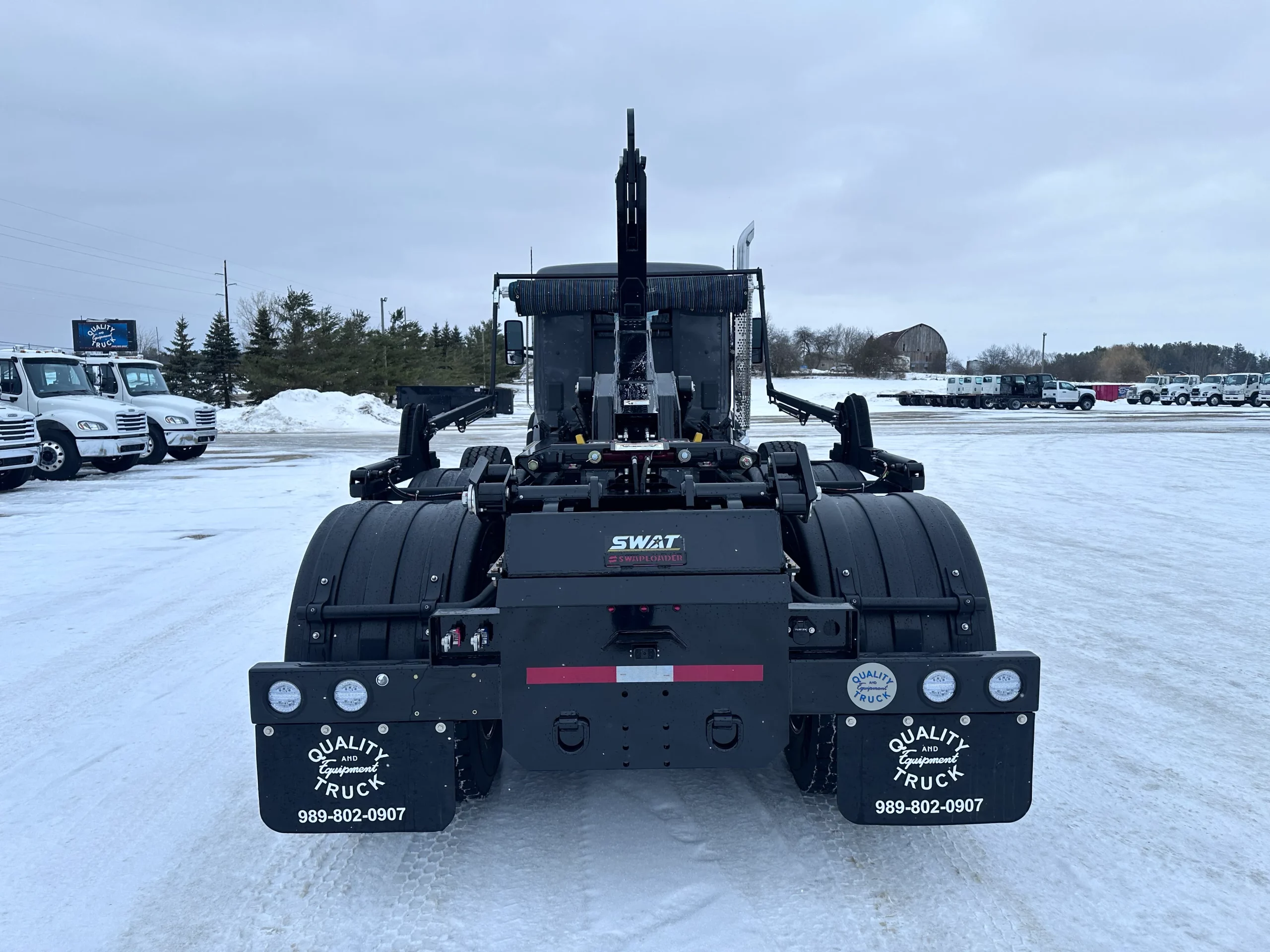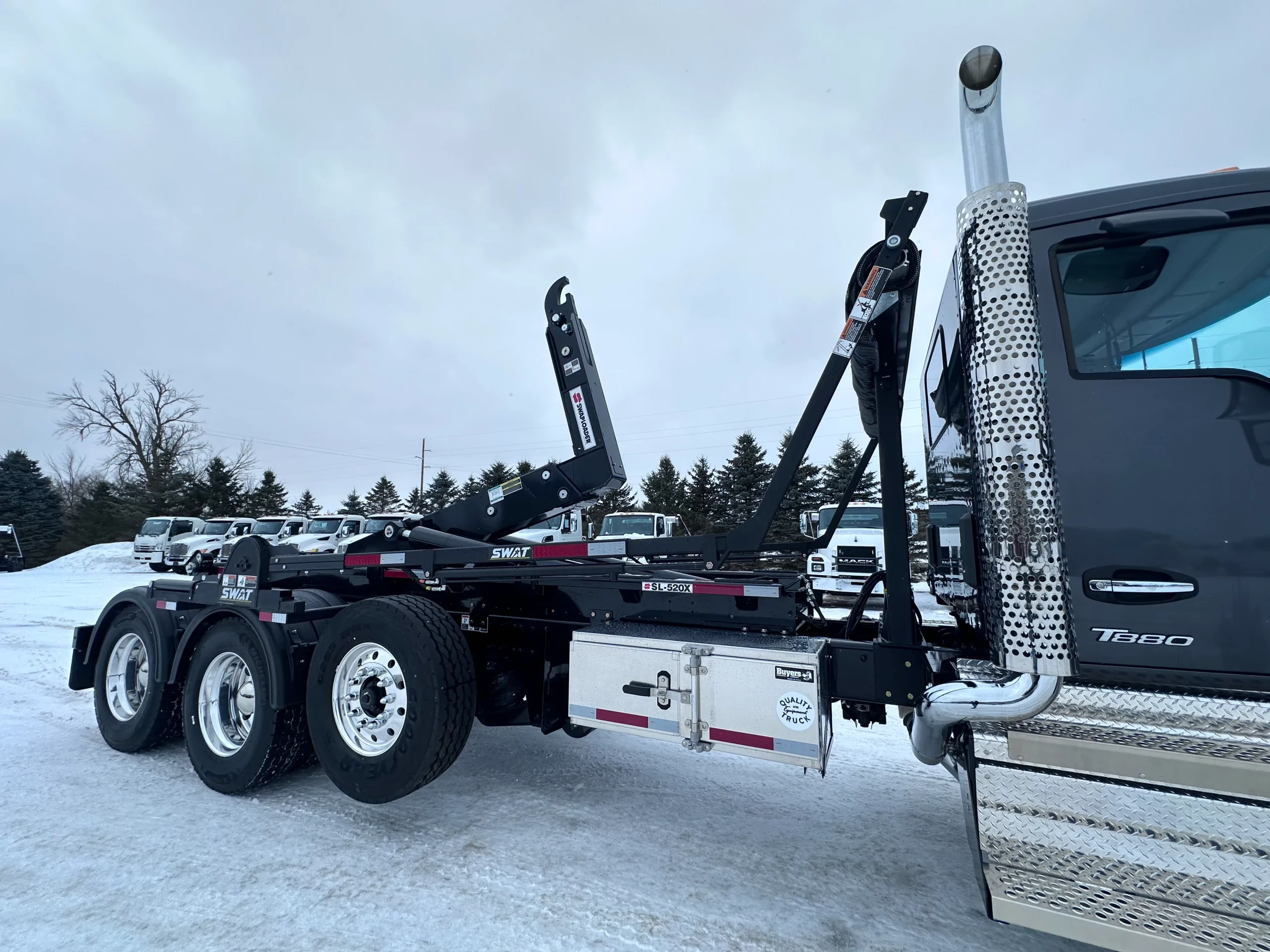 The 2025 Kenworth T880 Hooklift Truck features an 86,000-lb GVW chassis with a 265-inch wheelbase, a 20,000-lb steer axle, a 20,000-lb lift axle and a 46,000-lb drive axle capacity. It includes Chalmers suspension, a 195-inch cab-to-axle distance, and aluminum wheels with 425 / 65R22.5 virgin tread tires. Powered by a Cummins X15 diesel engine with 500 HP and a 100-gallon fuel tank, 14-gallon DEF tank, it pairs with an Allison 4500RDS 6-speed automatic transmission. The cab includes heated mirrors, air conditioning, and an LED display. Truck is upfit with the Swaploader SL-520X Hooklift, 50,000lbs Lifting Cap, 54” to 62” Manual Adjustable Hook Height, Can Handle Containers 17-22 Ft Optimally. Swaploader Universal Body Lock System Included. Truck add-ons include a Shurco Swat rack and pinion style tarp system, a Buyers Barn Door Style Toolbox, Custom Heavy Duty Quality Bumper with D-Rings and Pintle Hitch Option, Buyers 5-Way lights, Buyers Backup Camera, Buyers Strobe Lights.